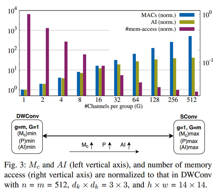 Variation of FLOPs and arithmetic instensityThe number of groups (g) in group convolution (GConv) is selected to boost the predictive performance of deep neural networks (DNNs) in a compute and parameter efficient manner. However, we show that naive selection of g in GConv creates an imbalance between the computational complexity and degree of data reuse, which leads to suboptimal energy efficiency in DNNs. We devise an optimum group size model, which enables a balance between computational cost and data movement cost, thus, optimize the energy-efficiency of DNNs. Based on the insights from this model, we propose an “energyefficient group convolution” (E2GC) module where, unlike the previous implementations of GConv, the group size (G) remains constant. Further, to demonstrate the efficacy of the E2GC module, we incorporate this module in the design of MobileNet-V1 and ResNeXt-50 and perform experiments on two GPUs, P100 and P4000. We show that, at comparable computational complexity, DNNs with constant group size (E2GC) are more energy-efficient than DNNs with a fixed number of groups (Fg GC). For example, on P100 GPU, the energy-efficiency of MobileNet-V1 and ResNeXt-50 is increased by 10.8% and 4.73% (respectively) when E2GC modules substitute the Fg GC modules in both the DNNs. Furthermore, through our extensive experimentation with ImageNet-1K and Food-101 image classification datasets, we show that the E2GC module enables a trade-off between generalization ability and representational power of DNN. Thus, the predictive performance of DNNs can be optimized by selecting an appropriate G.