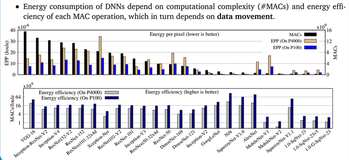Energy-efficiency in DNNsIn recent years, researchers have focused on reducing the model size and number of computations (measured as multiply-accumulate'' or MAC operations) of DNNs. The energy consumption of a DNN depends on both the number of MAC operations and the energy efficiency of each MAC operation. The former can be estimated at design time, however, the latter depends on the intricate data reuse patterns and underlying hardware architecture and hence, estimating it at design time is challenging. In this work, we show that the naive approach to estimate the data reuse, viz. arithmetic intensity, does not always correctly estimate the degree of data reuse in DNNs since it gives equal importance to all the data types. We propose a novel model, termed data type aware weighted arithmetic intensity'' ($DI$) which accounts for unequal importance of different data types in DNNs. We evaluate our model on 25 state-of-the-art DNNs on two GPUs and show that our model accurately models data-reuse for all possible data reuse patterns, for different types of convolution and different types of layers. We show that our model is a better indicator of energy efficiency of DNNs. We also show its generality using the central limit theorem. .